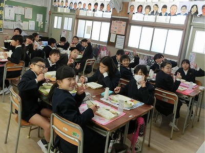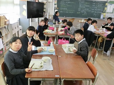 大阪白菜の煮びたしは、塩ゆでした後、だし汁に砂糖、しょう油を加えた後に鶏肉を煮た煮汁にひたしてありました。子どもたちにも人気で、お替わりもたくさんしてくれていました。