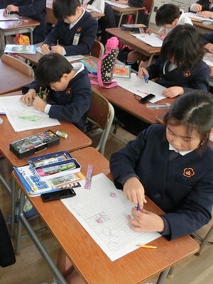 今日は1cmの方眼が印刷されたプリントに、コンパスで円や弧を書き、きれいな模様を作る学習でした。