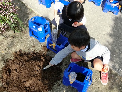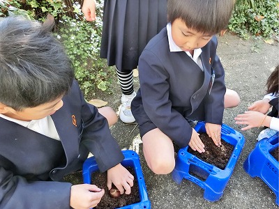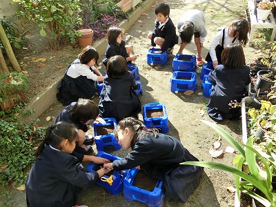 このクラスでは、アサガオを植えていた鉢を使って、春のお花の「チューリップ」の球根を植えていました。