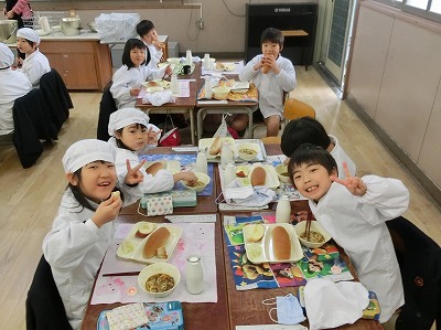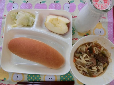 カレーうどんは、昆布と削り節で取った出汁がよく効いていて、うどんもこしがあっておいしかったです。牛肉、玉ねぎ、うすあげ、にんじん、青ネギが入っていました。寒い日にもってこいの献立で、みんなたくさん食べていました。