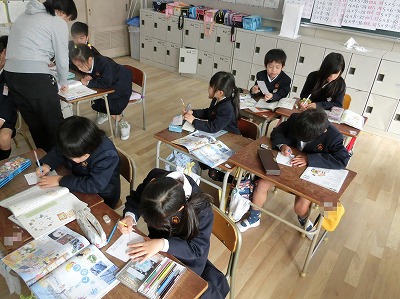 後半では、今年お世話になった人やお友だちに年賀状を書くことになり、先生から配られた画用紙に、「あけまして おめでとうございます」「今年もよろしくおねがいします」「2017年1月1日」などを書きこみ、来年の干支の「とり」や「富士山」「かがみ餅」などのイラストも描いていました。