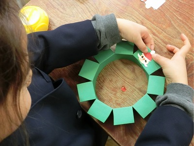 緑色の画用紙でリース部分を作り、そこに、様々な色の画用紙から、自分で飾りを作っていきます。