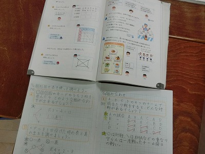 今日は今までの「並べ方」と違って、「A、B、C、Dの4つのチームでバスケットボールの試合をするのに、どのチームも違ったチームと1回ずつ試合をするとき、どんな対戦があるか」を学習していました。今日の学習は「組み合わせ」です。