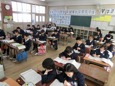 始業式を終え、学級活動では、冬休みの思い出を発表したり、今年の目標を書いたり、3学期の係り活動決め、席替えも行っていました。早速、冬休みの宿題プリントの答え合わせをしているクラスも多くありました。