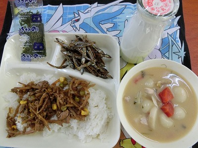 ごまめも給食室お手製です。砂糖、みりん、しょう油でからめられていました。しっかりした歯ごたえも残り、たくさん、子どもたちも食べてくれていました。