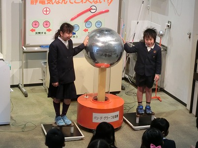 実際に児童の二人も前に出て、静電気発生装置により静電気をたくさん帯びた状態になるのを体験しました。