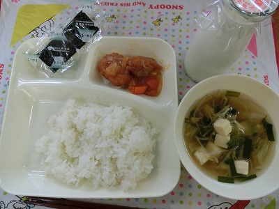 酢豚は、やわらかい一口大の角切りの豚肉がたくさん入っていました。お野菜もたけのこ、玉ねぎ、ニンジン、ピーマンと定番です。ケチャップ味でもあり、子どもたちはたくさんお替りして食べていました。