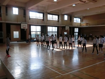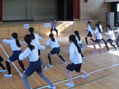 音楽に合わせて柔軟体操をしたり、ステップの練習をしたりして、楽しく授業を始めました。常に笑顔で楽しく、格好良く踊ることを大事にしている先生につられて、体も表情もほぐれていったようでした。