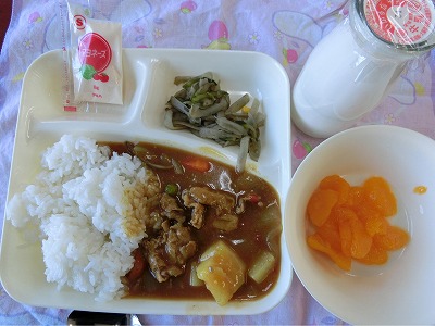 ハート型のラッキーニンジンが自分のカレーライスに入っていた子は大喜びでした。大盛り・お替りもたくさんしてくれて、やはりカレーライスは大人気です。写真は普通の配膳です。この後のお替りタイムでは、この2倍は軽く超えるほど大盛りに変身です。