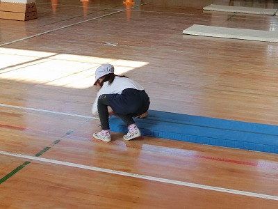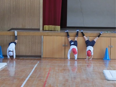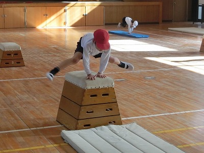 舞台のへりを使っての逆立ち移動、細いマットを使ってのサイドジャンプ、2段の跳び箱の上を越え、3段の跳び箱ジャンプへと続きます。