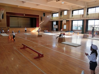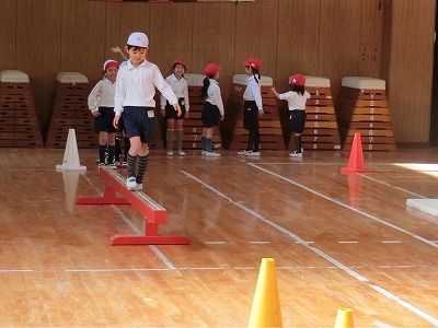 まず始めは、平均台です。その後、コーンの間をジグザグ走、マットで前転を2回と続きます。