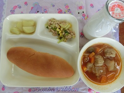 ミートボールのケチャップ煮は、チキンスープがベースで、ミートボール(肉だんご)、玉ねぎ、にんじん、しめじ、枝豆が入っていました。仕上げにケチャップで味付られているので、子どもたちには大好物の味付けです。とてもやわらかいミートボールもたくさん入っていました。