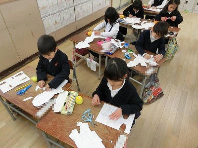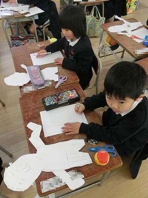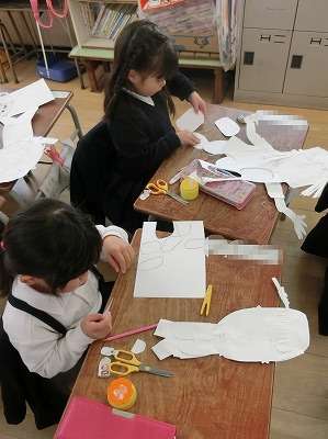 このクラスでは、今日は、手や足の部分を作成していました。画用紙に形の下書きを書き、はさみで切りとり、のりで貼っていきます。手の部分では、細長い指もうまく切って貼っている子もいました。