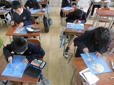 さすがに5年生です。先日紹介した初めての彫刻刀を使い出した4年生とは違って、1年の経験でしょうか、上手に彫刻刀を扱い、細かく、複雑な箇所もきれいに彫り進めていました。