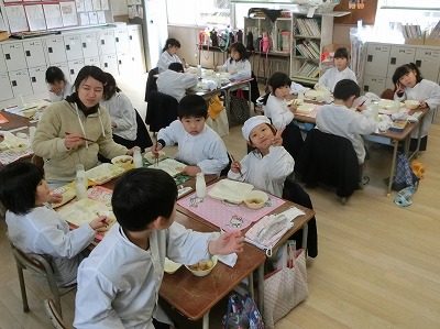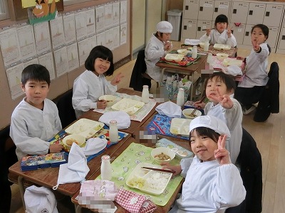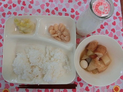 関東煮は、11月に続いて2回目のの登場です。鶏肉、厚揚げ、ジャガイモ、大根、ちくわ、こんにゃく、にんじん、そして「ウズラ卵」が入っていました。具材によく味がしみ込んでいておいしかったです。また、子どもたちの大好きなうずらの卵も入っており、お替りでは、先生に「たまご、入れて〜」とせがむ子が多かったです。