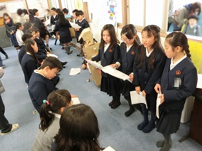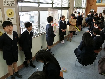 4年生は、音楽室を使って合同で「ゆめロボット」のプレゼンです。前半は1組、後半は2組が、それぞれのブースで、自分たちの「ゆめロボット」を紹介していました。段ボールでできたロボットの中に入り、動きで示している班もありました。掲示物もていねいに仕上がっていました。