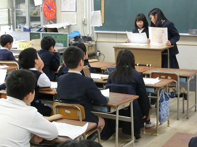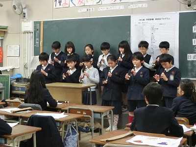 3年生は、二部構成です。前半は社会科の昔の生活の発表です。2〜3人で調べたテーマを、イラストも使って説明をしていました。後半はリコーダーの演奏です。3年生になって学習の始まったリコーダーですが、グループに分かれて披露です。かなり練習をしたのでしょう。ほとんどミスなく演奏できていました。