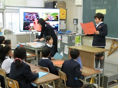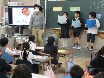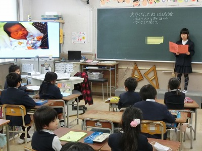 「大きくなったね」ということで、生まれたころや小さいころのエピソード、名前の付いた由来などを作文にまとめて、一人ずつ発表していました。大型モニタに映し出される赤ちゃんの時など、小さいころの写真がとてもかわいかったです。