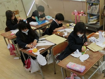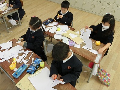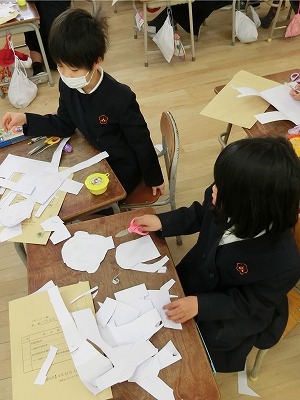 2月の上旬にも紹介しましたが、顔→胴体→手→足の順に制作していきます。このクラスでは、ほとんどの子が体の部分は終わっていました。