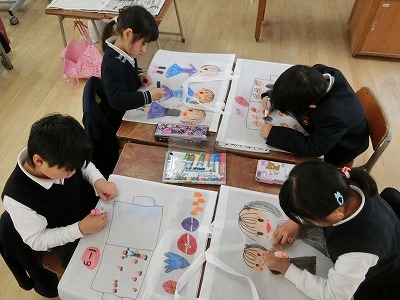 このクラスでは、学年末の作業の一つ「作品ぶくろ」の絵を描いていました。