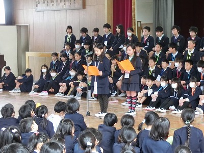 上:6年生の代表の児童さんが、在校生と教職員に対して「感謝の言葉」を言いました。
