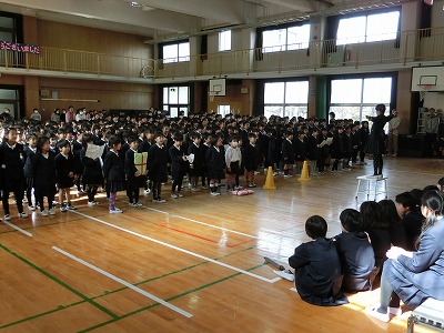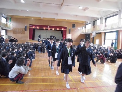 下:1〜5年生に見送られて、大きな拍手の中、6年生の退場です。