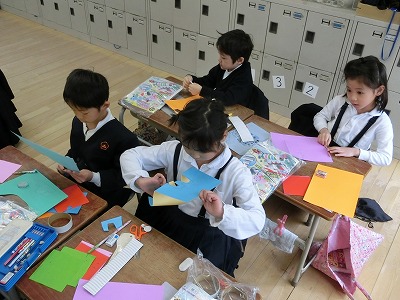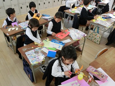 1年生の図工の授業風景です。紙版画が終わり、1年生での最後の題材でしょうか?