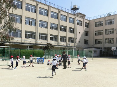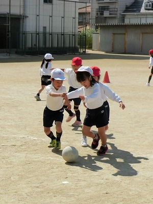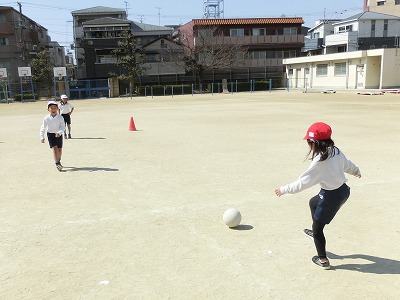 そんな中、1年生は元気よくボール蹴り運動です。