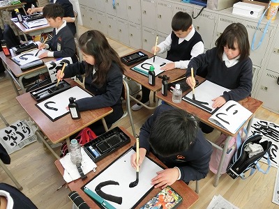 1枚目の半紙は「つ」ばかり、2枚目の半紙は「り」ばかりの練習で、3枚目からが「つり」です。納得のいかない子は、時間ぎりぎりまで先生に新しい半紙をもらって書いていました。