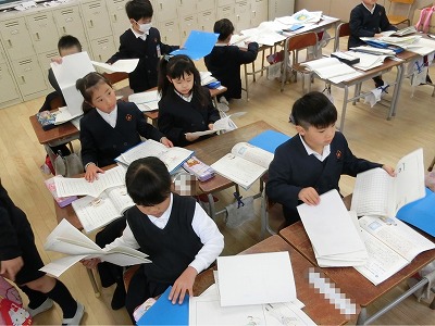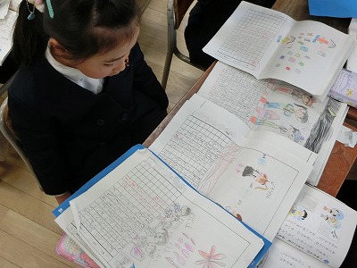 このクラスでは、入学してから今までに書いてきた行事や取り組みについての文章(絵つき)を、日付順に冊子にまとめていました。