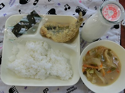 いわしのフライは、大ぶりで、開きをフライにしていました。小骨もありましたが、低学年さんでも問題なく食べれました。衣がサクサクでおいしくいただきました。でも、とんかつソースがないのを多くの子どもたちが、残念がっていました。