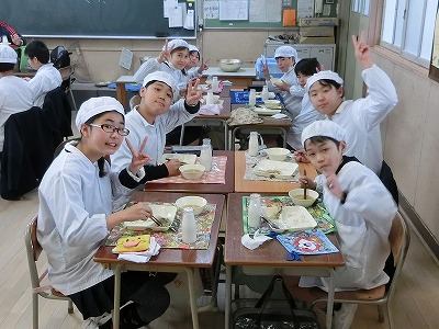焼きのりも、子どもたちに人気です。ご飯に巻いておにぎりのように食べている子もいました。低学年では、おはしを使ってのりでごはんを巻き込むのが難しいようで、ついつい、手で食べてしまっている子もいました。