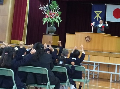 また、式中では、1年生はとってもお行儀よく、しっかりと校長先生やPTA会長様のお話を聞くことができました。PTA会長様の「マッスル」も早く覚えてくださいね。