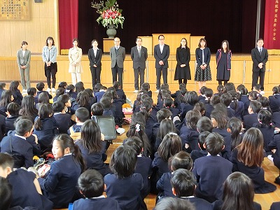まず、昨年度末の移動で本校を去られた教職員の方々の報告をし、その後、4月から本校に着任された7名の教職員の方々の紹介をしました。(詳しくは本日に配付した学校だよりをご覧ください。)