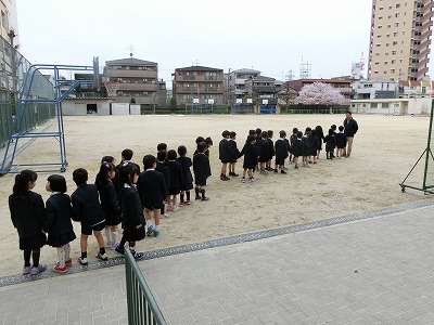 3時間目にあたる時間帯、1年生は広い運動場や運動遊具、花壇など、ミニ校内たんけんをしていました。