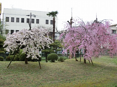 上:講堂横の芝生広場のしだれ桜と八重桜