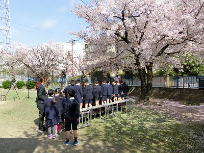 玄関付近でまず静かに整列し、担任の先生や写真屋さんの指示で、とても早く写真を撮影する隊形に並ぶことができました。