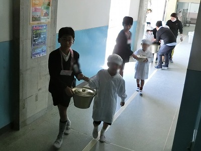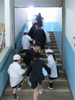 こぼさないように水平に保って廊下を進み、とくに階段は大変で、二人のスピードを合わせてあがっていきます。6年生が手を添えて、声をかけて、サポートです。