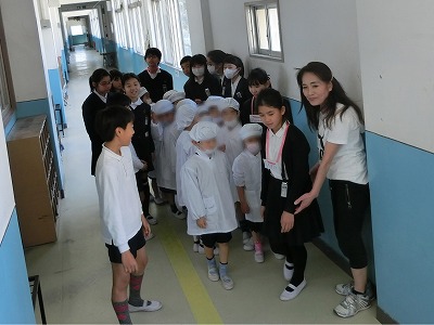 まずは廊下で、給食当番さんが整列です。自分の担当ごとに並んでいきます。
