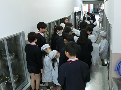 給食室前では、「今日の献立」を言い、つぎに「いただきます」と言います。給食室に入るときには、「1年○組です」と言って入ります。