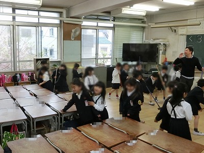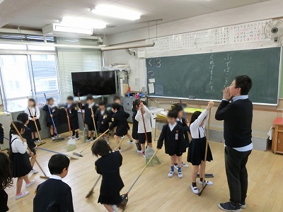 給食後は、全員でのお掃除タイムです。まだ、6年生が手伝ってくれているのですが、今日から1年生もほうきを持っての床掃き、机の移動を行いました。