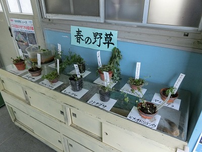 理科室前の展示ケースの上に「春の野草」が並びました。