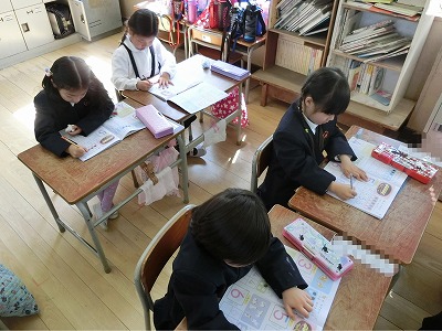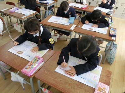 ひらがなの練習と同じで、先生の指導の後、手を挙げて空で書き、その後、お手本の上をなぞります。そして、4等分の補助線が書かれたマスの中に、お手本を見ながらていねいに書いていきます。