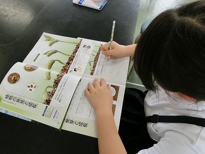 今までの学習を復習しながら、「種子が発芽するにはどのような条件が必要か」を予想して、ワークブックに記入していました。保護者の皆さんは、3つの条件を覚えていますか?
