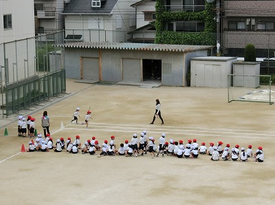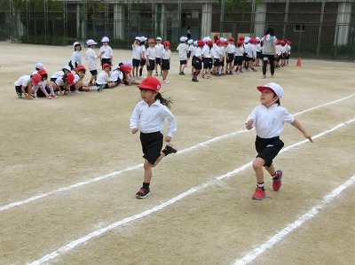 「位置について、よーい、ドン(旗を下から上にあげる動作)」で、1組さんと2組さんとで競争です。