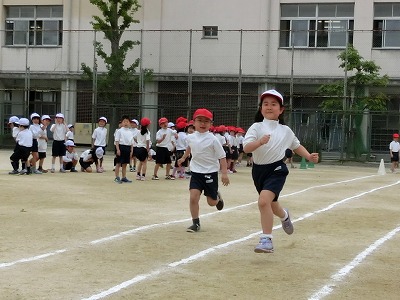 準備運動、体ほぐしが終わって、今日は50m走に挑戦です。