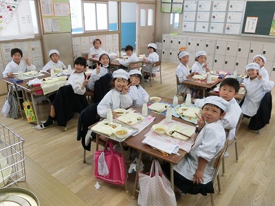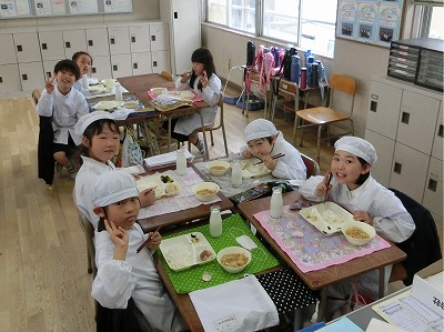 今日、このクラスではお誕生日の子がおり、「いただきます」の後、みんなで牛乳ビンを持って「おめでとう! かんぱ〜い!!」と、みんなで祝っていました。