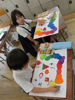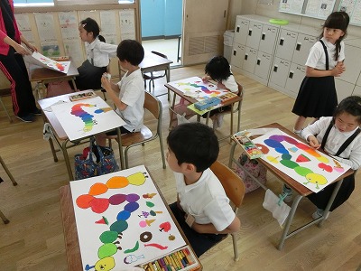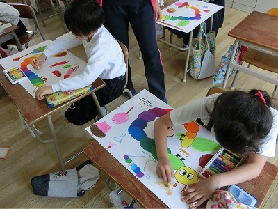 このクラスでは、今日は子どもたちは、「あおむしくん」の周りに、果物やケーキなどあおむしくんへの食べ物を思い思いに描いていました。