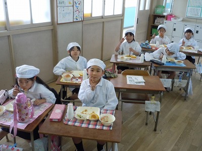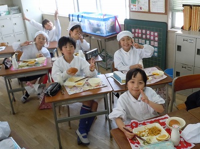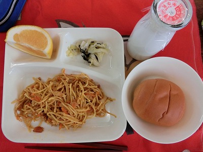 カレースパゲッティは、ミートソースのカレー版です。とにかく、おなかペッコペコの子どもたちの食欲をそそります。パンにはさんで食べる子、大きな口をあけて一気に食べる子、とにかく1年生から6年生までよく食べてくれていました。食缶は全部のクラスで空っぽです。
