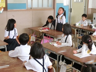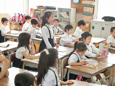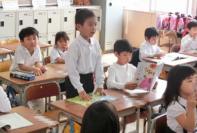 このクラスでは、教科書の「あめ ですよ」を教科書を見ないで発表していました。